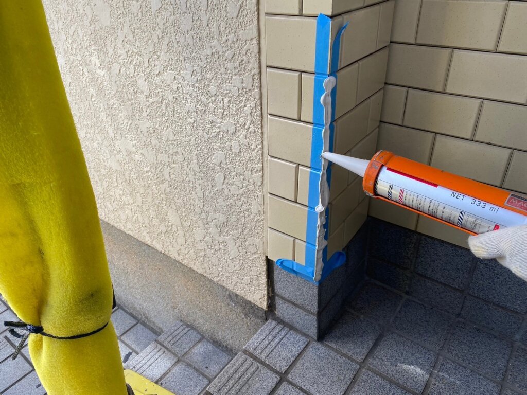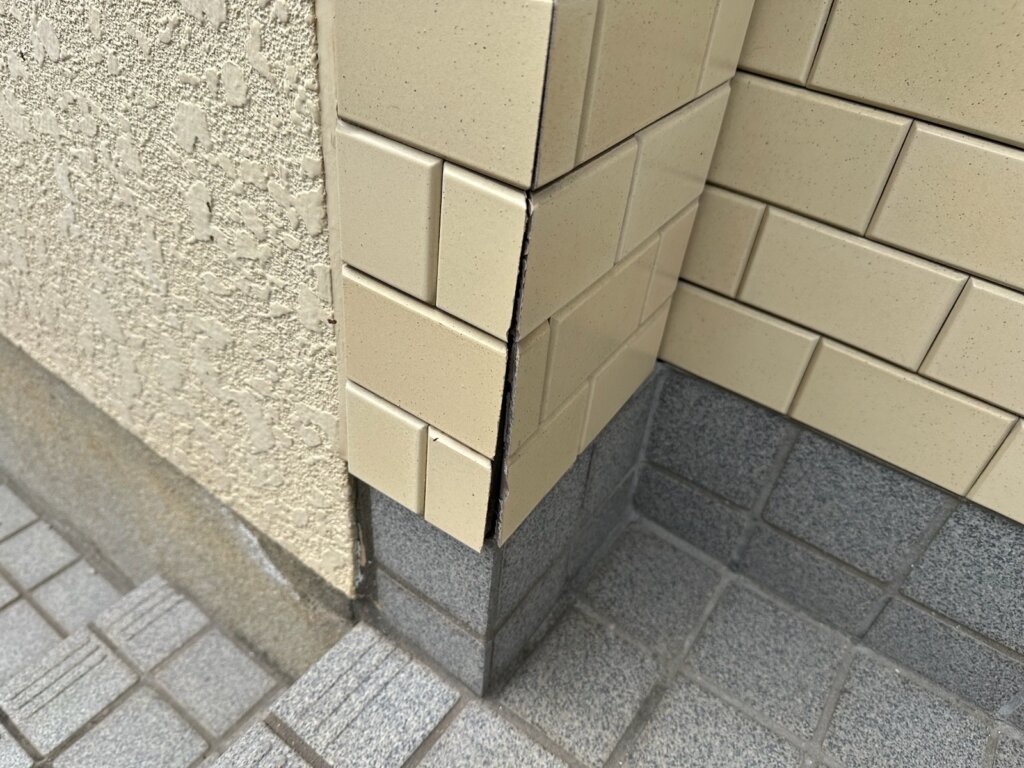 タイル出隅部の目地シーリングは破断して隙間が生じ、外壁にはチョーキング現象が見られました。