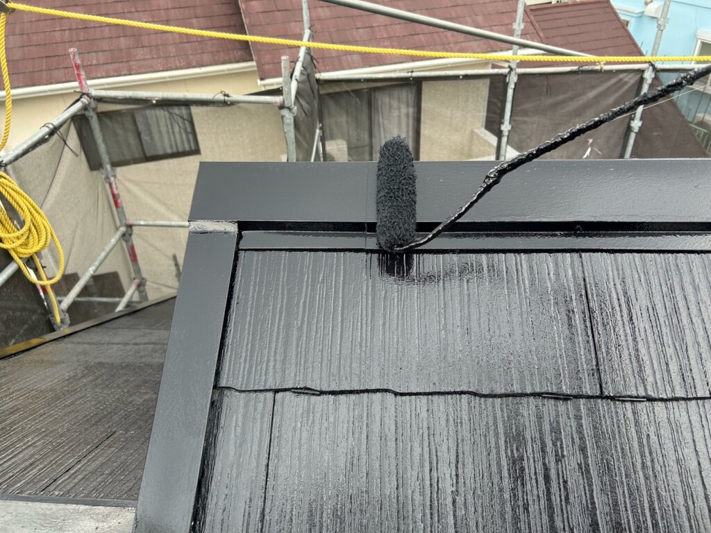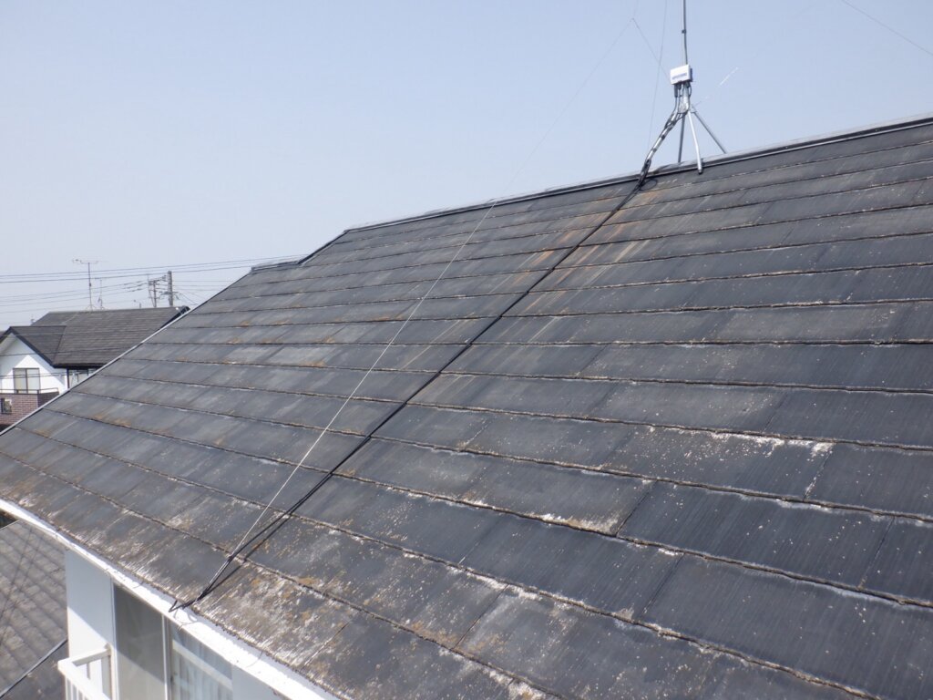 屋根は塗膜の退色・劣化が進行し、表面の防水性低下が見られる状態です。
