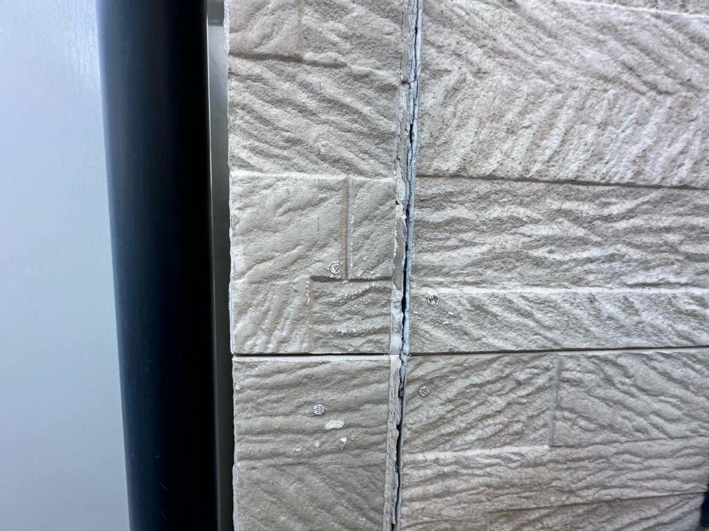 外壁材の一部に浮き・反りが生じ、目地のズレが確認されます。