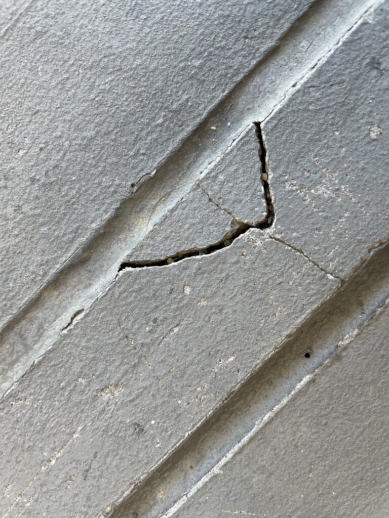 外壁には各所にひび割れやモルタルの浮きが確認され、雨水の浸入や劣化が懸念される状況です。