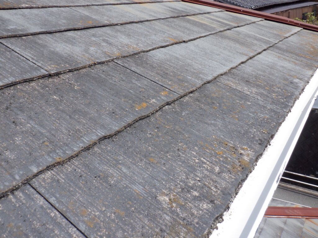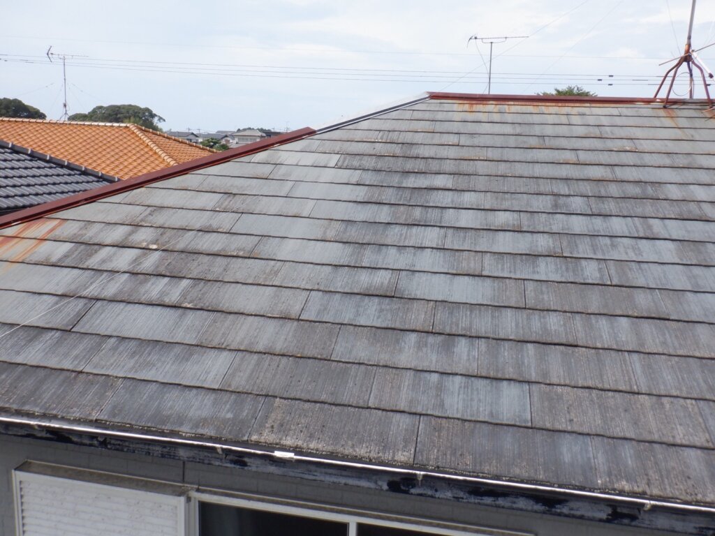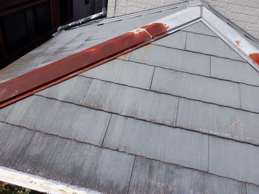屋根全体に色あせや苔の付着、棟板金には錆が見られ、劣化が進行していました。