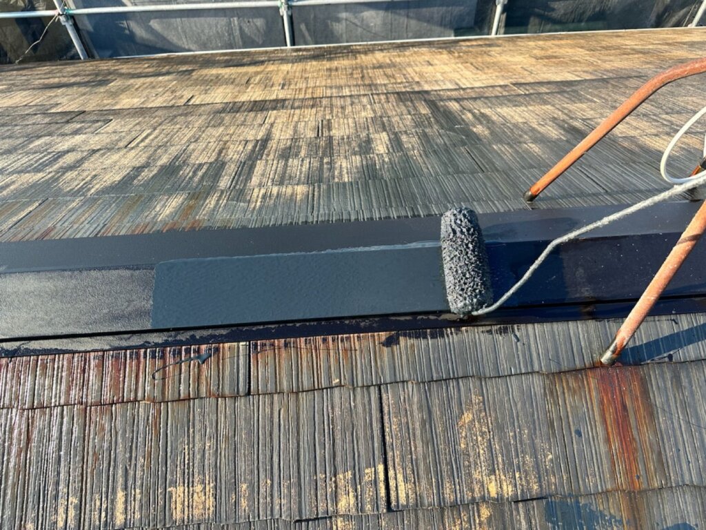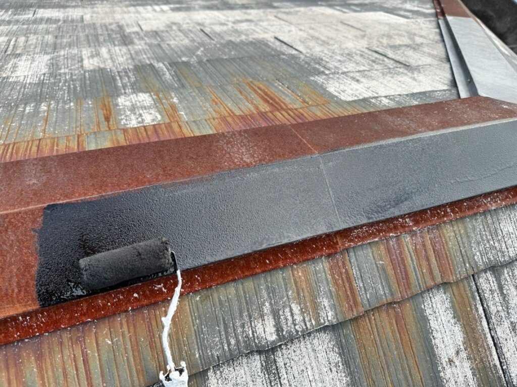 錆が進行していた棟板金は本来は交換することがベストですが、築年数とお客様のご状況も考慮し、可能な限り錆を落として2液の錆止め材を使用し、上塗り材でしっかり仕上げました。