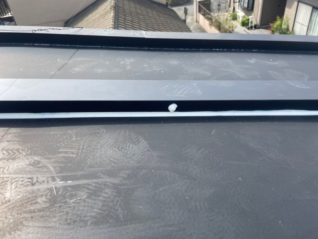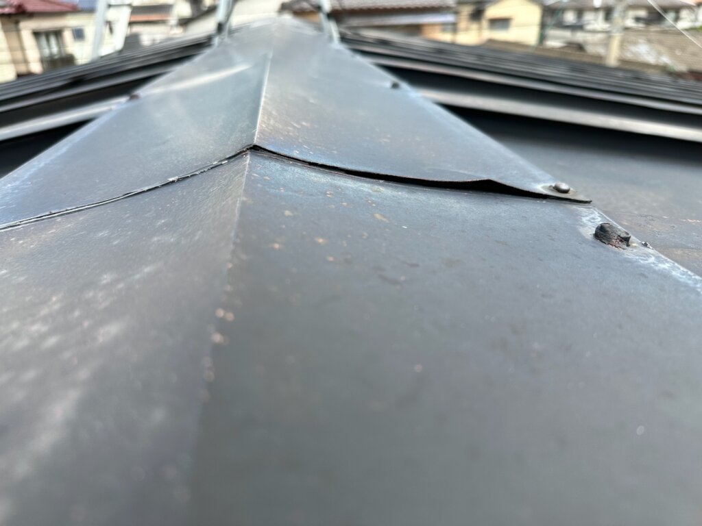 風で棟板金が浮き上がり、ビスの浮きや棟板金取り合い部のシーリング破断も見られる状態でした。