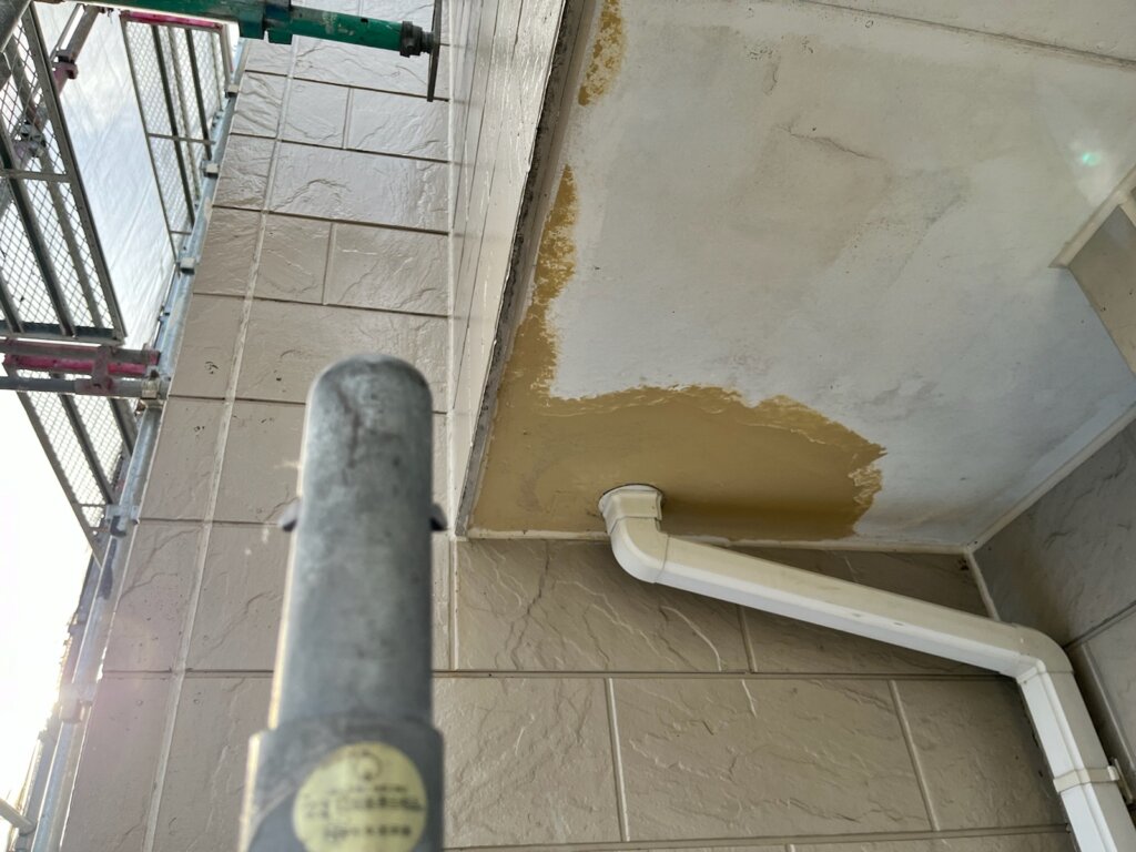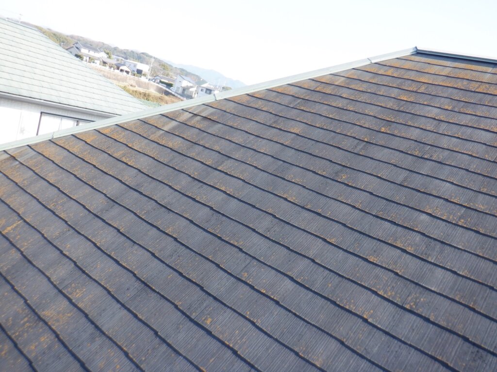 バルコニー床から雨水が浸入し、下の天井に雨漏りが発生しており、屋根は苔や退色が進んでいました。